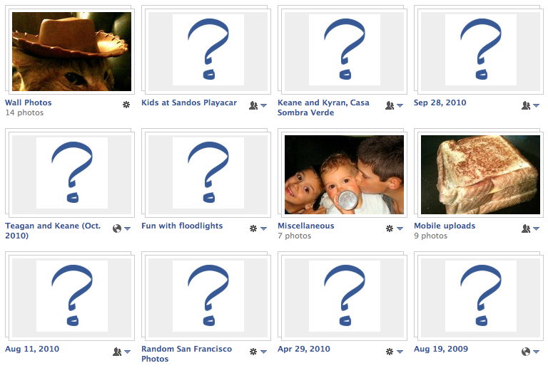 The above screenshot shows the state of my photo albums on Facebook. All the ones with a question mark have no photos. Looks like FB just lost them all. Good thing I don’t rely on FB for my online photos. I’d much rather post them to my site (those were exceptions, and I of course have the originals). 🙂